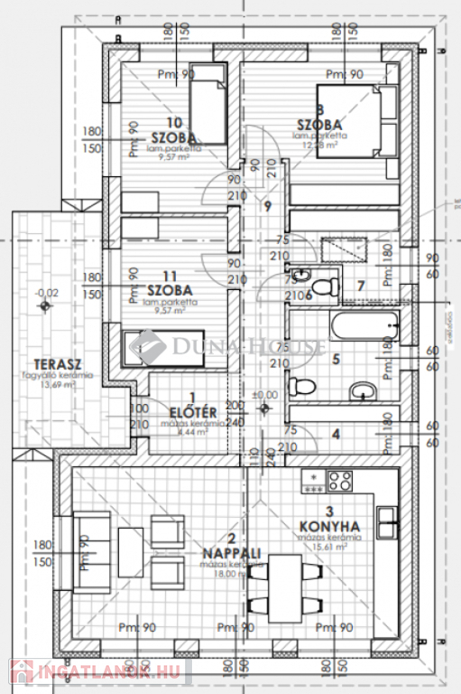 Az ingatlan 93 m2 hasznos alapterülettel + 14 m2 nyitott terasszal rendelkezik.Helyiségeket tekintve kialakításra kerül 3 darab hálószoba, amerikai-konyhás nappali kamrával, fürdő WC-vel + egy külön WC, háztartási helyiség, előtér és közlekedő.