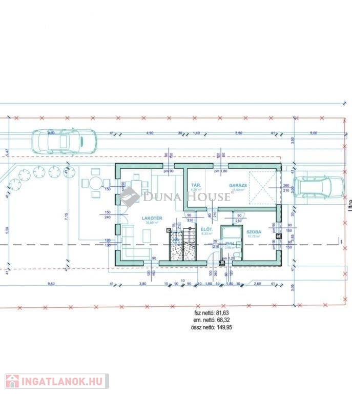 Földszinten: Tágas nappali+konyha étkező, zuhanyzó+wc, előtér, szoba, garázs 18.50 m2 , tároló, nyitott terasz.