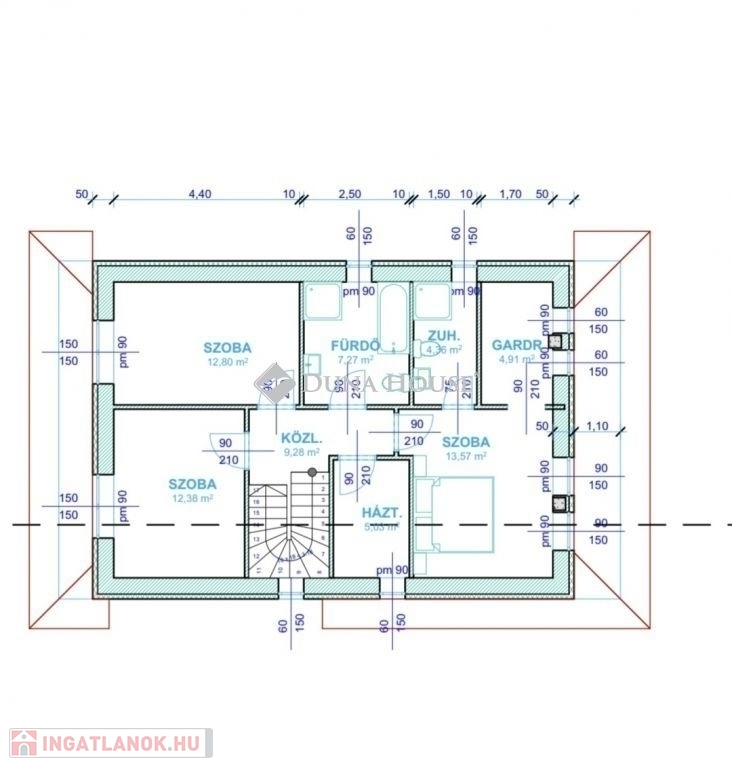 Emeleten: 2 szoba, 1 felnőtt hálószoba azon belül nyílik egy gardrób és zuhanyzó+wc, közlekedő, további fürdőszoba+wc.