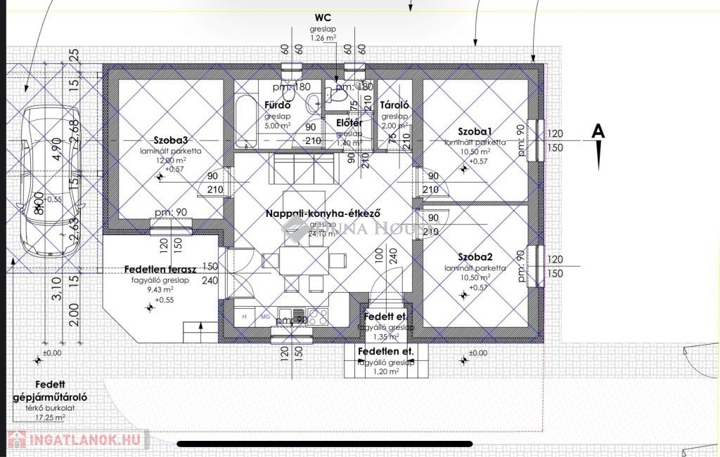 fedett gépkocsitároló: 17,10 m2