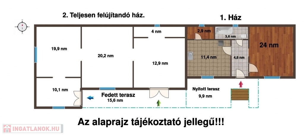 -Méret: 46,7 m² + 9,9 m² betonozott nyitott terasz