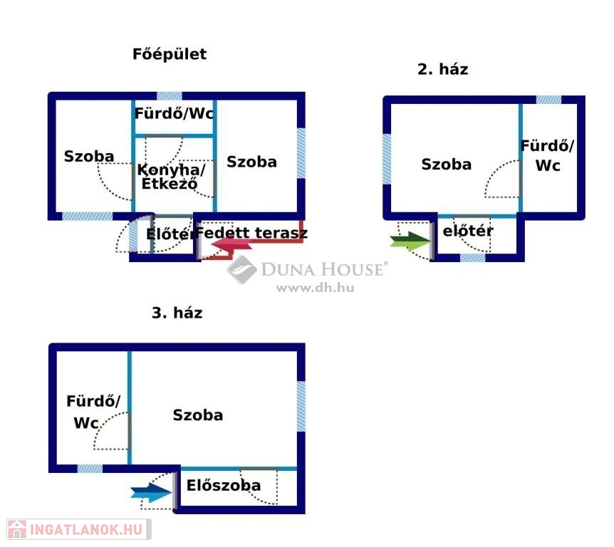 Pánd belterületén a központ közelében eladó 3 házikó - egy telken belül! AKÁR 3 GENERÁCIÓNAK is alkalmas! BEEKTETÉSRE IS KIVÁLÓ, hisz 3 külön lakrész alakítható ki belőle. Az első kettő házban minden közmű bekötésre került (villany, víz, gáz, csatorna). A harmadik házat pedig jelentleg tárolóként használják - itt a víz és a villany került bekötésre. Az udvarra autóbeállási lehetőség is van!A főépület (1. ház) 2 különbejáratú szobából, étkezős/konyhából, fürdő/mosdóból és egy előszobából áll. (44 m2) + 9 m-2-es fedett terasz is tartozik hozzá). A második épület (18 m2) Egy szobából, fürdő/wc-ből és egy előszobából áll. A harmadik épület (20 m2) tárolóként funkcionál - de ott is egy szoba, előszoba és egy fürdő/mosdó helyiség lett kialakítva.Az ingatlanok lakható állapotban - de felújításra szorulnak.Jelenleg albérlők lakják a házat, így a birtokbaadás 60 nap.Közelben: iskola, művelődési ház, posta, Abc, óvoda, buszmegálló stb.