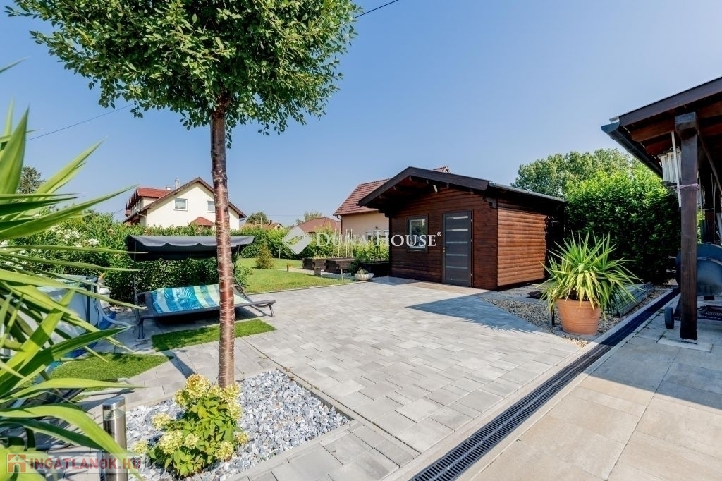A házat körülölelő kert igényesen parkosított, rendezett, intim, ideális pihenésre, családi és baráti összejövetelekre.