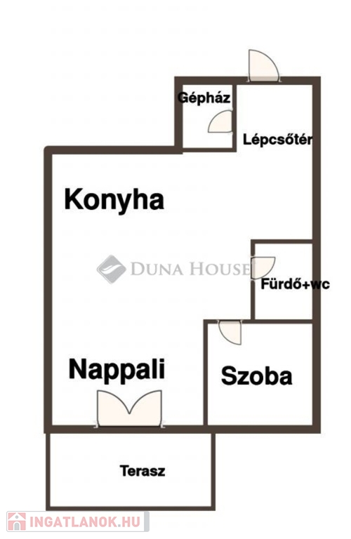 földszinten: szoba, tágas nappali+konyha, zuhanyzó+wc, gépészet, nyitott terasz.