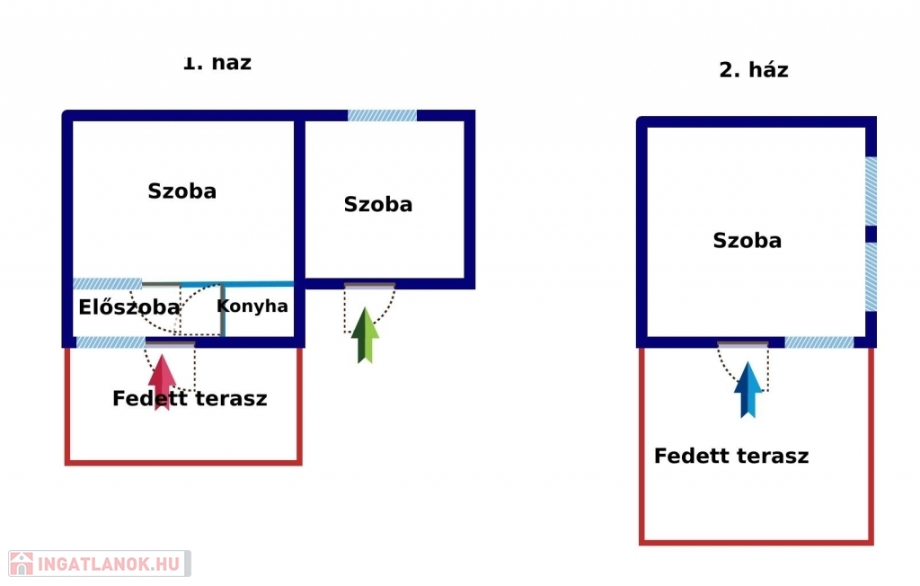 Tápiószentmárton üdülőterületén eladó 2 kis nyaraló bútorozottan egy telken belül, mely akár azonnal birtokba vehető 1/1 tulajától tehermentesen! Mindkét ház könnyűszerkezetes, szigetelt! Az első házba a villany bevezetésre került (16 amper). A telken belül a vezetékes víz megtalálható, valamint az utcában a gáz is. Az első ház (30 m2) + 14,5 m2-es nagy fedett teraszon keresztül közelíthető meg, majd az előszobába lépünk. Jobbra egy kis konyha került kialakításra. Innen tovább pedig a szobába érünk. A ház mellett még egy szoba került kialakításra, mely teljesen külön bejáaton közelíthető meg. Egy kémény is kiépítésre került, így akár kandalló vagy kályha fűtés berakható, de elektromos fűtési lehetőséget is ki lehet alakítani.